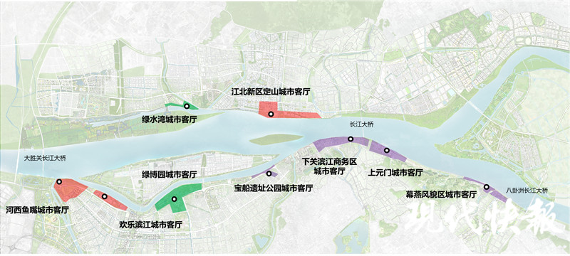 今年,《南京魅力濱江2035》出爐,提出要打造9大濱江城市客廳,如今這些客廳建設進展如何?南京市規(guī)劃和自然資源局城市設計處吳欣鑫介紹,南京的九大客廳各有定位。河西魚嘴城市客廳:將“青春揚子江”與江豚主題相結合,建設江豚互動廣場和活力運動水岸,打造南京國際形象和生態(tài)文明相融合的重要窗口。歡樂濱江城市客廳:打造集觀景、演出、休閑、游憩等多功能的濱江活動廣場,是交流和娛樂的歡樂舞臺。綠博園城市客廳:以綠博園為生態(tài)背景,強化河西文體軸與濱江的聯系,與江蘇大劇院聯動打造生態(tài)、綠色、活力的時尚文化客廳。寶船遺址公園客廳:集合寶船文化遺產、濱江公園、渡江勝利紀念碑和紀念館資源,打造國家級航海文化和紅色文化展示平臺。下關濱江商務區(qū)客廳:強調對近代歷史記憶的表達,建設近1公里的二層平臺,連接中山碼頭、大馬路、老江口等文化遺產,重現20世紀初下關商埠風貌。上元門城市客廳:挖掘達摩“一葦渡江”的傳說和金陵船廠工業(yè)遺產,形成歷史特色鮮明的創(chuàng)意園區(qū)。幕燕城市客廳:重現“燕磯夕照、永濟江流”等金陵經典盛景,依托山水人文資源,打造宜居宜游的城市客廳典范。江北新區(qū)定山城市客廳:依托江北核心區(qū)資源,建設形成新區(qū)最重要的新城門戶、智慧客廳。綠水灣城市客廳:結合江北青奧體育公園,打造縱覽大江景色的濕地游園和弘揚青奧精神的生態(tài)客廳。