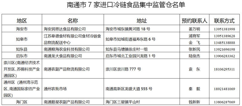 一、從2020年11月23日起,南通海安市、如皋市、如東縣、啟東市、崇川區(qū)、通州區(qū)、海門區(qū)各設(shè)立1個(gè)進(jìn)口冷鏈?zhǔn)称芳斜O(jiān)管倉(以下簡稱“集中監(jiān)管倉”),南通經(jīng)濟(jì)技術(shù)開發(fā)區(qū)、蘇錫通科技產(chǎn)業(yè)園區(qū)與崇川區(qū)共用集中監(jiān)管倉,通州灣示范區(qū)、南通國際家紡產(chǎn)業(yè)園區(qū)與通州區(qū)共用集中監(jiān)管倉。集中監(jiān)管倉設(shè)置和運(yùn)行根據(jù)實(shí)際需要,全市統(tǒng)籌,動(dòng)態(tài)調(diào)整。