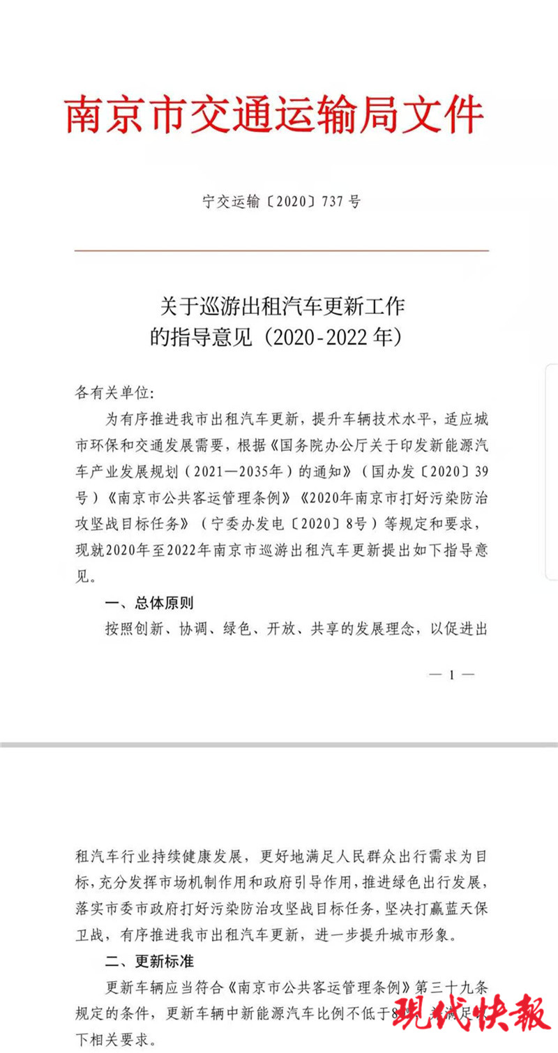 (記者 李娜)不久前,現(xiàn)代快報(bào)曾報(bào)道過南京51家傳統(tǒng)出租車公司開始“上新”,未來兩三年內(nèi)將基本更新為新能源車輛。11月23日,現(xiàn)代快報(bào)記者了解到,南京市交通運(yùn)輸局于日前發(fā)布了《關(guān)于巡游出租汽車更新工作指導(dǎo)意見》(以下簡稱“指導(dǎo)意見”),指導(dǎo)意見提出,更新車輛中新能源汽車比例不低于80%,企業(yè)每更新 10 輛新能源汽車將獎(jiǎng)勵(lì) 1 輛新能源巡游出租汽車經(jīng)營權(quán)指標(biāo),鼓勵(lì)“巡約一體”融合發(fā)展。
