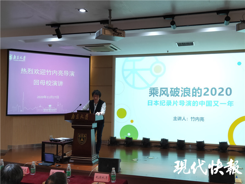 (記者 邱驊悅 文/攝)11月27日上午,拍攝了《南京抗疫現場》《好久不見,武漢》等專題紀錄片的日本導演竹內亮回到了他的母校南京大學,以《乘風破浪的2020——日本紀錄片導演的中國又一年》為主題進行演講。除了講述自己的經歷以外,竹內亮還通過演講鼓勵在場的學生,多交日本朋友,多用不同的視角看世界。