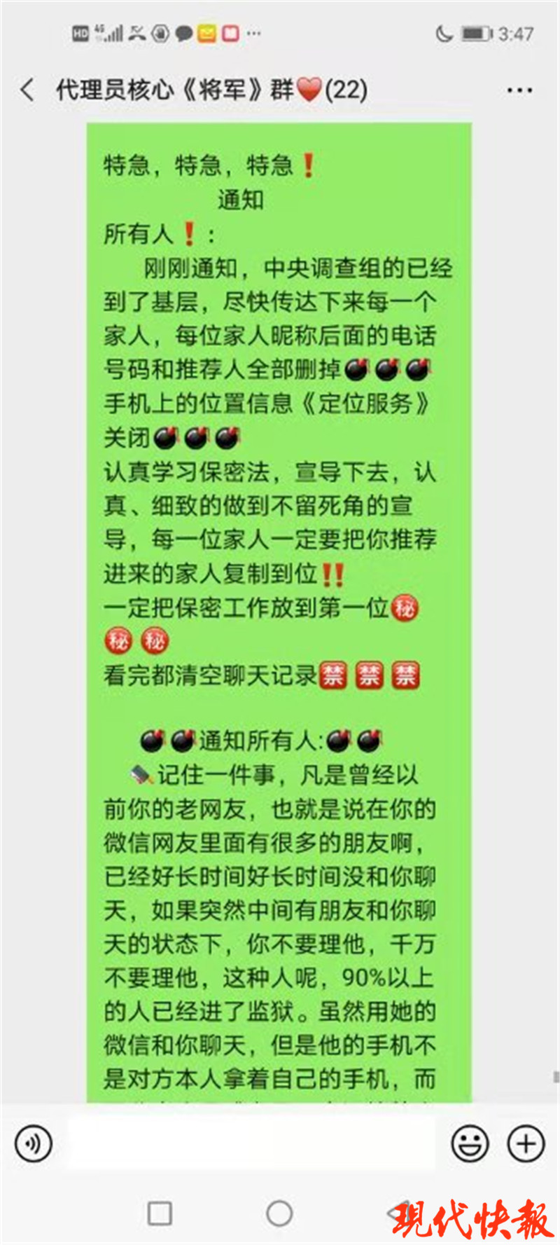 辦案民警介紹,該犯罪團伙假借國家政策和社會熱點,宣稱“民生保障網(wǎng)”為國家精準扶貧項目,只要繳納3400元的“入網(wǎng)費”后便可成為會員,享受債務清零、征信洗白和高額返利等“國家福利”。他們利用互聯(lián)網(wǎng)社交工具,在微信群內(nèi)傳發(fā)所謂“中央文件”“領導講話”“官方新聞”,對團伙成員進行傳銷式“洗腦”,以小投入獲得大回報為誘餌實施犯罪,在短短4個月內(nèi)已發(fā)展成一個人數(shù)眾多、層級分明的跨省市犯罪團伙,各層級均有相應的代理商、統(tǒng)計員、講師及收款員等角色。經(jīng)查證,該案中的“民生保障網(wǎng)”項目確為公安部公布的“人際網(wǎng)”項目“改頭換面”的產(chǎn)物。
