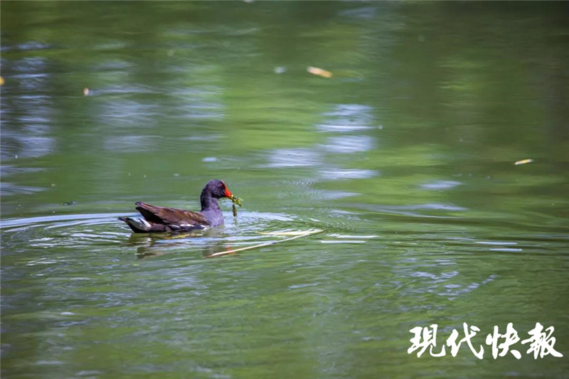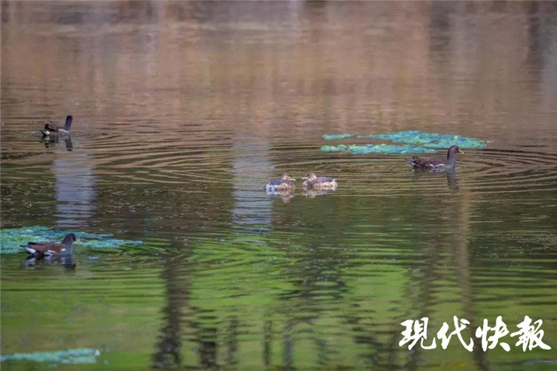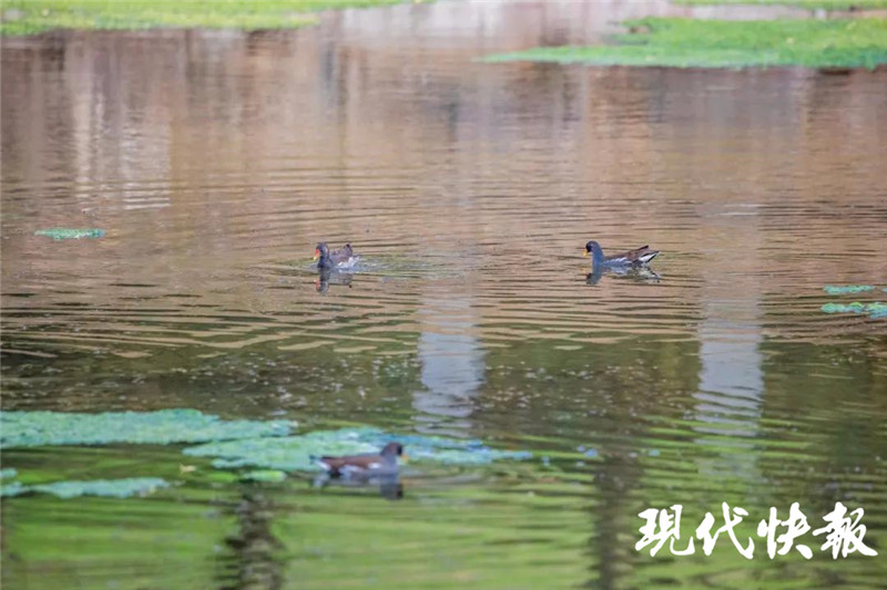 外形和鴨子一樣的䴙䴘比較常見,全湖可見。它們比較膽小,常常在蘆葦叢中營巢,或者成群在水上游蕩。通體黑褐色的黑水雞多在荷花種植區(qū)內(nèi)活動。