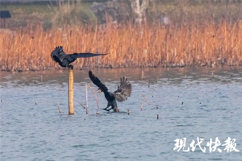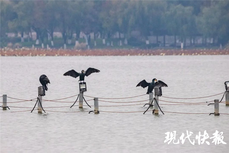現(xiàn)代快報(bào)記者在湖畔看到,一大群鸕鶿棲息在湖面的圍欄上,或是伺機(jī)捕魚,或是展開翅膀晾曬羽毛,烏黑的羽翼在陽光下泛著光澤。記者了解到,從11月初起,鸕鶿就會準(zhǔn)時(shí)來玄武湖過冬,進(jìn)入12月數(shù)量開始增多,每年都在50只以上,多的年份會超過100只。