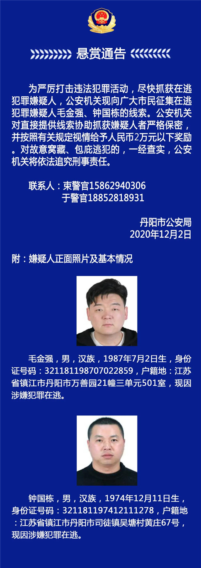 (通訊員 王丹 記者 曹德偉)12月2日,平安鎮(zhèn)江、丹陽公安發(fā)布懸賞通告,征集兩名在逃犯罪嫌疑人毛金強、鐘國棟的線索,希望廣大市民能夠提供線索協(xié)助抓獲犯罪嫌疑人。公安機關(guān)對直接提供線索協(xié)助抓獲嫌疑人者將嚴格保密,并按照有關(guān)規(guī)定視情給予人民幣2萬元以下獎勵。對故意窩藏、包庇逃犯的,一經(jīng)查實,公安機關(guān)將依法追究刑事責(zé)任。
