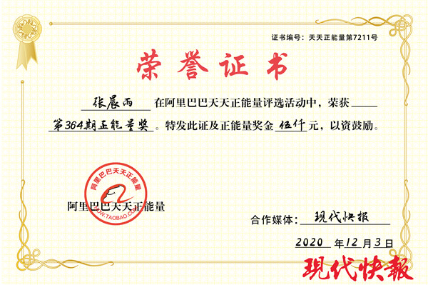小伙捐獻(xiàn)干細(xì)胞推遲婚禮的事跡,經(jīng)現(xiàn)代快報(bào)報(bào)道后,引起了知名公益平臺(tái)阿里巴巴天天正能量的關(guān)注。12月3日,在揭曉的第364期正能量周評(píng)選中,經(jīng)媒體評(píng)委和正能量合伙人評(píng)委投票、網(wǎng)友點(diǎn)贊,張晨雨獲得第364期正能量獎(jiǎng),獎(jiǎng)金5000元。