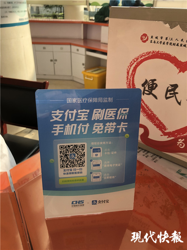 當(dāng)天上午,現(xiàn)代快報(bào)記者來到鹽城市第三人民醫(yī)院門診大廳,只見便民服務(wù)臺(tái)的旁邊放著醫(yī)保電子憑證的宣傳標(biāo)語,工作人員正耐心指導(dǎo)就醫(yī)人員使用醫(yī)保電子憑證。