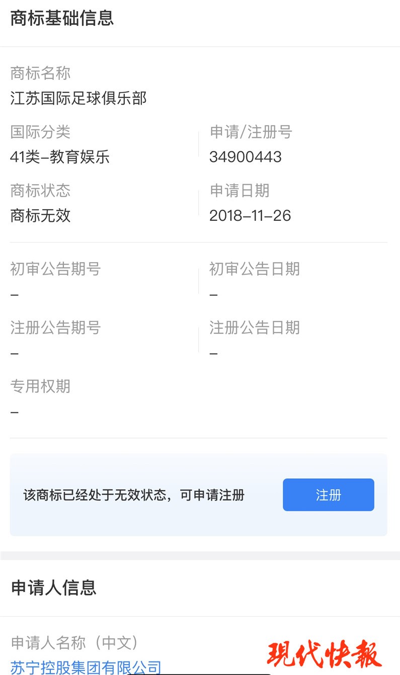 現(xiàn)代快報(bào)記者查詢“天眼查”發(fā)現(xiàn),早在2018年11月26日,蘇寧控股集團(tuán)有限公司就申請(qǐng)注冊(cè)了“江蘇國(guó)際足球俱樂(lè)部”這一名稱。據(jù)傳,這個(gè)名字也得到了不少蘇寧高層的青睞。但“江蘇國(guó)際”也有一個(gè)劣勢(shì),據(jù)記者了解,這一名稱雖然注冊(cè)足球俱樂(lè)部沒(méi)有問(wèn)題,但很難被注冊(cè)成為商標(biāo)。目前,“天眼查”顯示,“江蘇國(guó)際足球俱樂(lè)部”商標(biāo)狀態(tài)仍為“無(wú)效”。不過(guò),像“大連人”“深圳市足球俱樂(lè)部”等,也顯示商標(biāo)注冊(cè)無(wú)效。綜合來(lái)說(shuō),江蘇國(guó)際仍是江蘇蘇寧更名進(jìn)程中最具競(jìng)爭(zhēng)力的名字。