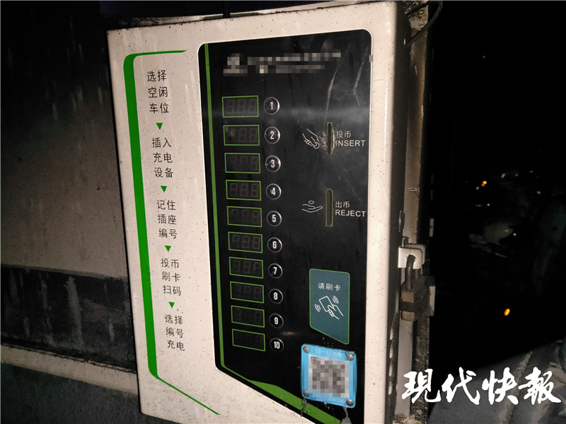 記者在現(xiàn)場注意到,車庫里安裝了一款付費式電動車充電站。這款充電站與墻壁上的充電插座相連,可供10輛電動車同時充電,它的使用說明中寫道:“充電站自帶斷路保護,充滿自停,過流過載保護。充電器短路會自動斷電,過載去掉后可直接恢復(fù)。”