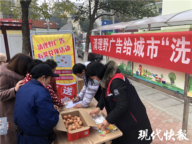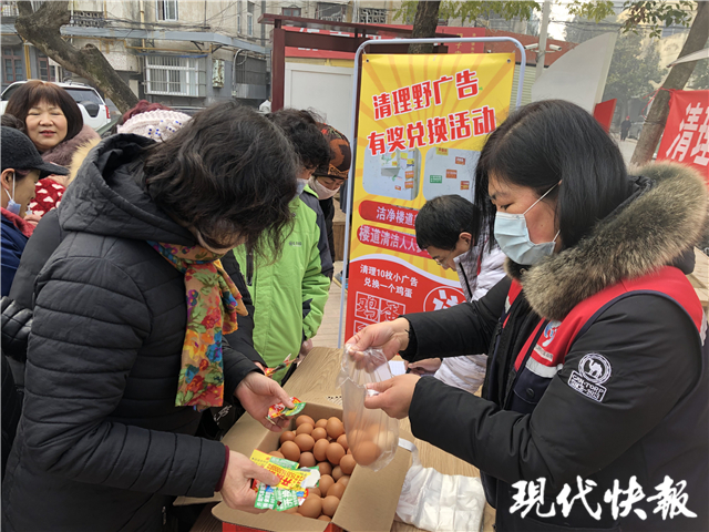 (通訊員 羅津菁 記者 張曉培)“每10張野廣告可兌換1個(gè)雞蛋。”近日,在徐州市泉山區(qū)永安街道紡南社區(qū)黨群服務(wù)中心門口,居民孫阿姨剛剛完成了一筆“交易”,她將從自家樓棟里清理下來(lái)的野廣告交給社區(qū)工作人員清點(diǎn),“清理了30多張小廣告,換了3個(gè)雞蛋,這買賣值。”孫阿姨拿著雞蛋高興地說(shuō)。