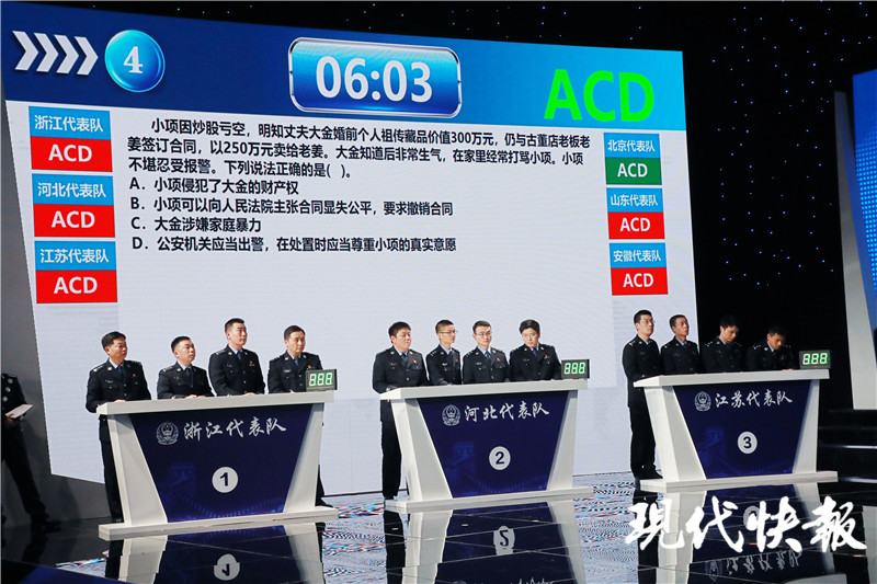 現(xiàn)代快報(bào)記者了解到,通過(guò)初賽選拔,全國(guó)公安機(jī)關(guān)32支代表隊(duì)成績(jī)排名前6的北京、江蘇、河北、安徽、浙江、山東代表隊(duì)進(jìn)入決賽。經(jīng)過(guò)決賽的激烈角逐,江蘇代表隊(duì)榮獲一等獎(jiǎng),安徽代表隊(duì)、北京代表隊(duì)榮獲二等獎(jiǎng),山東代表隊(duì)、河北代表隊(duì)、浙江代表隊(duì)榮獲三等獎(jiǎng)。同時(shí),評(píng)出優(yōu)秀組織獎(jiǎng)和優(yōu)秀個(gè)人獎(jiǎng),并頒發(fā)獎(jiǎng)匾。