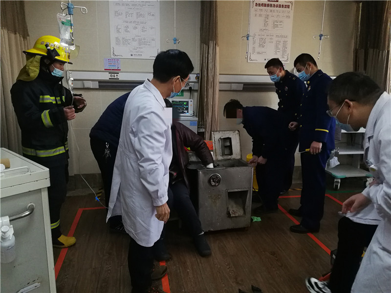 △消防員在醫(yī)院急診室破拆絞肉機