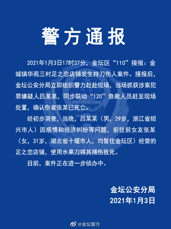 通報(bào)稱:2021年1月3日17時(shí)37分,金壇區(qū)110接報(bào):金城鎮(zhèn)華苑三村足之戀店鋪發(fā)生持刀傷人案件。接報(bào)后,金壇公安分局立即組織警力趕赴現(xiàn)場,當(dāng)場抓獲涉案犯罪嫌疑人呂某某,同步聯(lián)動(dòng)“120” 急救人員趕至現(xiàn)場處置,確認(rèn)傷者張某已死亡。