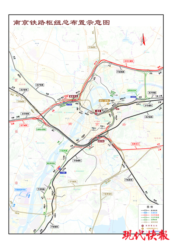 “十三五”期間,南京交通部門研究推動《南京鐵路樞紐總圖規(guī)劃(2016-2030)》批復,南京鐵路樞紐將形成“兩環(huán)、八射、十五線”的環(huán)+放射“米”字型高鐵網(wǎng)格局,環(huán)線上布設南京北站、南京站、南京南站三大主客站。