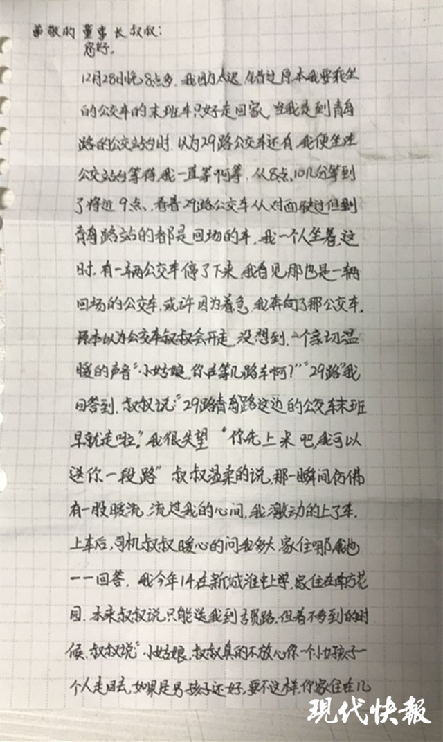 “小姑娘,你在等幾路車(chē)啊?”“29路青島路這邊的公交車(chē)末班車(chē)早就走啦。”“你先上來(lái)吧,我可以送你一段路。”“小姑娘,叔叔真的不放心你自己走回去,我把你送回去吧。”……信中,女孩回憶了司機(jī)對(duì)她說(shuō)的每一句話,用真誠(chéng)質(zhì)樸的語(yǔ)言描述了駕駛員叔叔對(duì)自己的關(guān)心,并表示誠(chéng)摯的感謝。