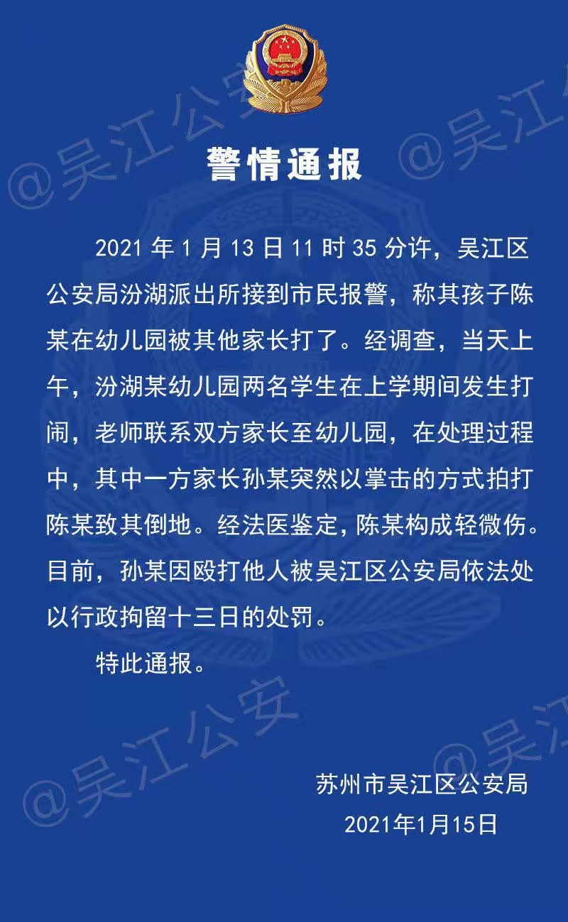 (記者 高達(dá))1月15日下午,蘇州市吳江區(qū)公安局發(fā)布警情通報(bào)。通報(bào)稱,2021年1月13日11時(shí)35分許,吳江區(qū)公安局汾湖派出所接到市民報(bào)警,稱其孩子陳某在幼兒園被其他家長打了。經(jīng)調(diào)查,當(dāng)天上午,汾湖某幼兒園兩名學(xué)生在上學(xué)期間發(fā)生打鬧,老師聯(lián)系雙方家長至幼兒園,在處理過程中,其中一方家長孫某突然以掌擊的方式拍打陳某致其倒地。經(jīng)法醫(yī)鑒定,陳某構(gòu)成輕微傷。目前,孫某因毆打他人被吳江區(qū)公安局依法處以行政拘留十三日的處罰。