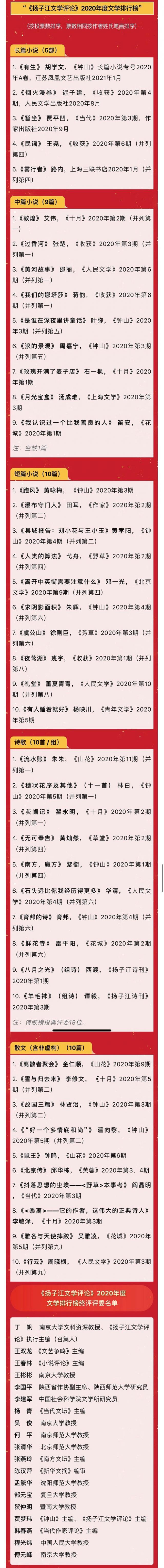 (記者 陳曦)1 月 16 日,備受關(guān)注的《揚子江文學(xué)評論》2020 年度文學(xué)排行榜發(fā)布,胡學(xué)文《有生》、艾偉《敦煌》、黃詠梅《跑風(fēng)》、朱朱《流水賬》、金仁順《離散者聚會》等作品榮列長篇小說、中篇小說、短篇小說、詩歌、散文(含非虛構(gòu))五大榜單榜首。