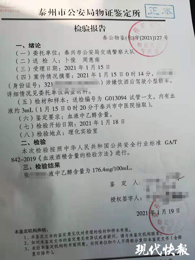 1月19日,醫(yī)院血檢驗(yàn)結(jié)果顯示,張某酒精含量達(dá)到176.4mg/100ml,遠(yuǎn)遠(yuǎn)超過(guò)醉駕標(biāo)準(zhǔn)。