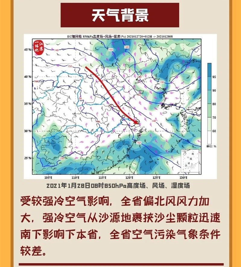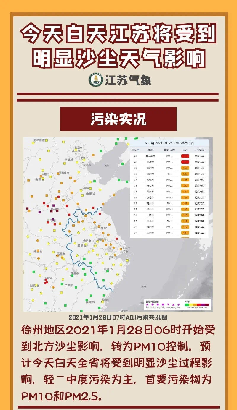 江蘇氣象解釋說,受較強冷空氣影響,強冷空氣從沙源地裹挾沙塵顆粒迅速南下影響下本省,全省空氣污染氣象條件較差。預(yù)計未來3天,空氣質(zhì)量仍以輕度污染為主。1月31日淮河以南地區(qū)陰有小到中雨,受降水濕清除作用,31日起空氣質(zhì)量將有所改善。