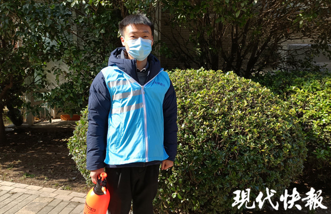 戴好一次性手套和口罩,來到居民家門口,首先對擺放在門邊的兩大袋垃圾進(jìn)行消殺,門口、墻角每個(gè)角落都沒有放過,消殺結(jié)束后提著垃圾離開。這樣的一套流程,倪彩文每天都要重復(fù)兩遍。