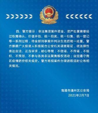 四、警方提示:非法集資案件資金、資產(chǎn)處置需要經(jīng)過權(quán)屬確認(rèn)、價(jià)值評(píng)估、統(tǒng)一拍賣、統(tǒng)一歸集、統(tǒng)一登記等一系列過程,待全部刑事案件判決生效后統(tǒng)一處置。警方提醒廣大投資人積極配合公安機(jī)關(guān)調(diào)查取證,依法理性表達(dá)合法、正當(dāng)訴求,耐心等候;不信謠、不傳謠,不組織、不策劃、不參與各類非法聚集維權(quán)活動(dòng);自覺遵守通州區(qū)疫情防控相關(guān)規(guī)定。警方將視案件辦理進(jìn)程適時(shí)公布相關(guān)情況。