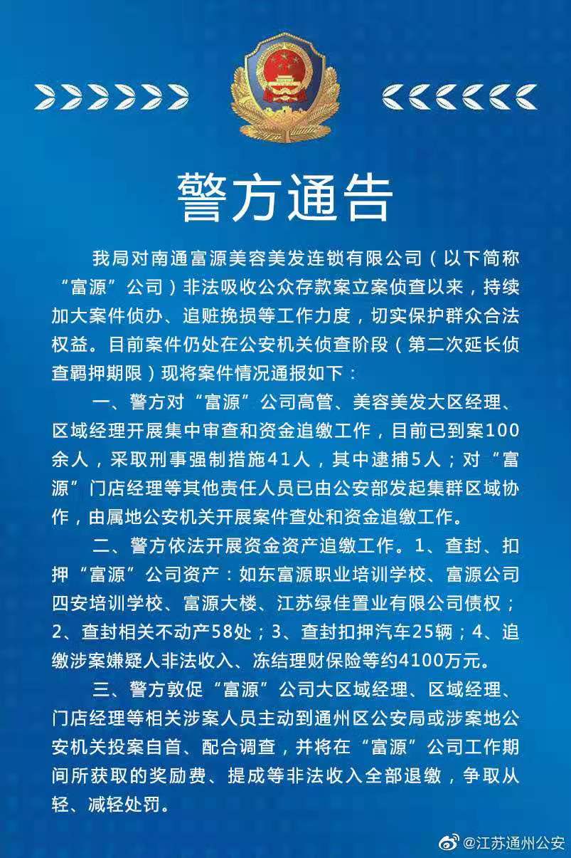 (記者 嚴(yán)君臣)2月7日,南通市通州區(qū)公安分局通過官方微博@江蘇通州公安 發(fā)布對(duì)南通富源美容美發(fā)連鎖有限公司(以下簡(jiǎn)稱“富源”公司)非法吸收公眾存款案的偵查情況。通報(bào)內(nèi)容顯示,立案?jìng)刹橐詠?,該局持續(xù)加大案件偵辦、追贓挽損等工作力度,切實(shí)保護(hù)群眾合法權(quán)益。目前案件仍處在公安機(jī)關(guān)偵查階段(第二次延長(zhǎng)偵查羈押期限)現(xiàn)將案件情況通報(bào)如下: