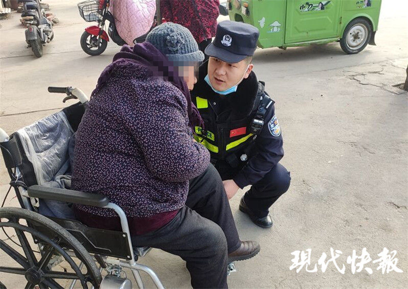到達(dá)現(xiàn)場(chǎng)后,民警一邊安撫老人不要著急,一邊試著與其溝通,無(wú)奈老人聽(tīng)不懂普通話,情急之下,老家是外地的陳鵬立即試著用自己學(xué)來(lái)的蹩腳的贛榆話與老人展開(kāi)交流。經(jīng)過(guò)耐心詢問(wèn),終于得知老人姓許,今年90歲,家住青口鎮(zhèn)中心社區(qū),一早坐著輪椅出門想去二兒子家看望孫子,不想走著走著迷路了,幸好遇到熱心群眾幫忙報(bào)警求助。