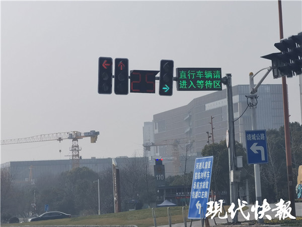 目前在江東中路江山大街路口,南京交管部門在北口施劃4股車道直行等待區(qū),在南口施劃了4+1股車道直行等待區(qū)。最長的等待區(qū)可達70米,南北雙向一共可容納48輛等待車輛。在正前方信號燈旁設有一塊LED電子提示屏。當LED屏幕顯示“直行車輛請進入等待區(qū)”字樣時,雖然直行信號燈為紅燈,但是直行車輛可以越過停止線駛入到直行等待區(qū)。隨后直行信號綠燈亮起后,LED提示屏字樣變?yōu)?ldquo;左轉車輛請進入等待區(qū)”。
