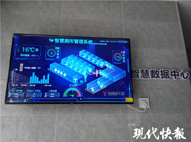 記者看到,在公廁入口的大門兩側(cè),設(shè)置了人流量監(jiān)測儀,門內(nèi)墻面上安裝了智慧廁所管理系同大屏,只要有人進(jìn)入,“今日總?cè)肆髁?rdquo;數(shù)據(jù)就會增加。廁所建設(shè)單位技術(shù)人員介紹,人流量的數(shù)據(jù)會實時傳輸?shù)胶笈_,環(huán)衛(wèi)管理部門可以調(diào)取這些數(shù)據(jù),并根據(jù)數(shù)據(jù)分析出流量峰值,便于管理員保潔。除此以外,廁所使用情況也能在大屏上看到。