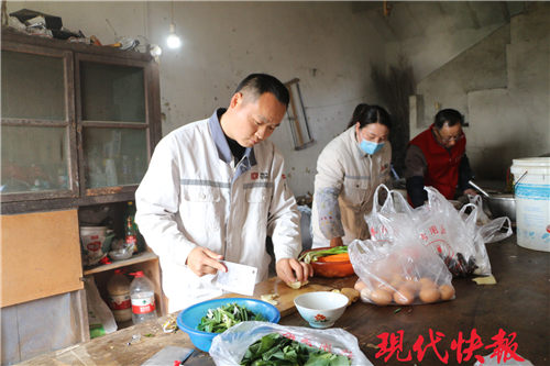 水槽安裝完沒多久,義工們準備的燒雜燴、紅燒肉燴土豆、紅燒獅子頭、青椒洋蔥炒肉絲、西紅柿炒雞蛋等菜肴也上桌了,老人們邊吃邊夸,笑得合不攏嘴。