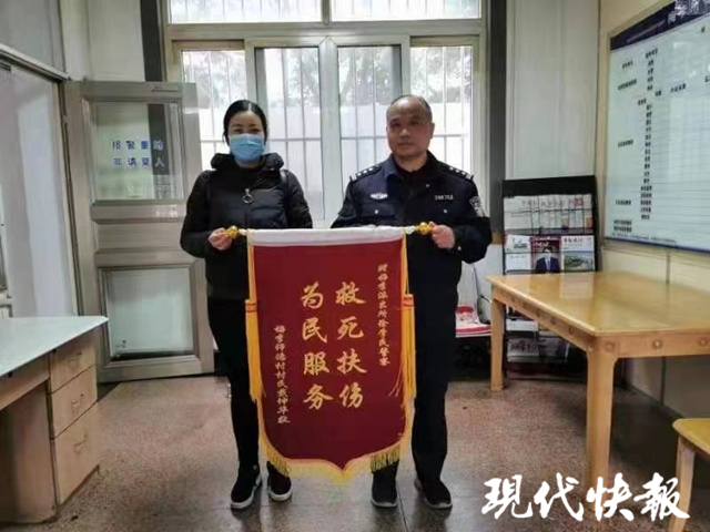 戴先生的女兒戴女士心存感激,一直苦苦尋找救了他父親的好心人。直到不久前,戴女士去藥店買藥,與店員聊起了當(dāng)天的事,店員表示當(dāng)天救了她父親的就是梅李派出所社區(qū)民警徐學(xué)明,于是戴女士連忙制作了錦旗送到了派出所,送上了遲到的感謝。