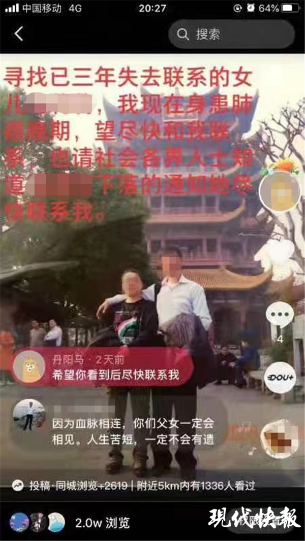 (通訊員 王國(guó)禹 虞瑜方 記者 曹德偉)5年前,鎮(zhèn)江丹陽(yáng)女孩曉麗(化名)負(fù)氣離家出走,此后杳無(wú)音信。5年后,父親身患癌癥,想在有生之年找到女兒,可卻怎么也聯(lián)系不上。無(wú)奈之下,求助到轄區(qū)派出所。民警靈機(jī)一動(dòng),將父女的合照拍成了短視頻,沒(méi)想到經(jīng)過(guò)一個(gè)多月的傳播,竟真的幫助這對(duì)父女團(tuán)圓了。
