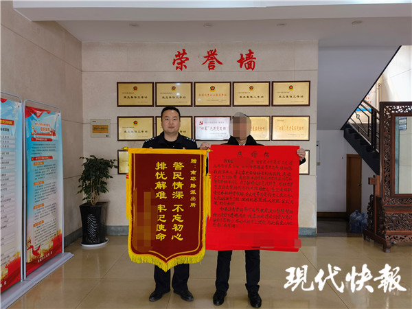 3月15日上午,丹陽(yáng)市云陽(yáng)街道九房村居民馬某興沖沖地來(lái)到丹陽(yáng)市公安局南環(huán)路派出所,向民警蔡科平遞上一面寫有“警民情深不忘初心 排憂解難牢記使命”16個(gè)大字的錦旗,感激道;“謝謝民警同志,圓了我的心愿……”