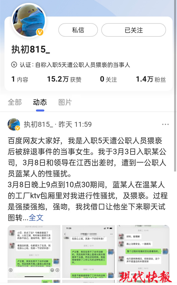 現(xiàn)代快報記者發(fā)現(xiàn),該網(wǎng)帖發(fā)布于3月15日,@執(zhí)初815_ 在網(wǎng)帖中稱,自己于3月3日入職廣州某公司,3月8日和領(lǐng)導(dǎo)在江西出差,期間在一家KTV包廂中遭到當(dāng)?shù)厮痉ň忠凰{姓副局長的強吻、摟抱,觸摸隱私部位等騷擾。