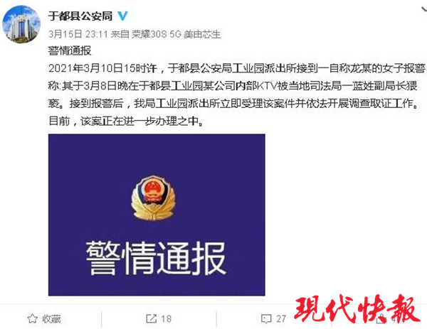 記者注意到,3月15日23點11分,江西于都縣公安局通過其官方微博發(fā)布了“警情通報”:“2021年3月10日15時許,于都縣公安局工業(yè)園派出所接到一自稱龍某的女子報警稱:其于3月8日晚在于都縣工業(yè)園某公司內(nèi)部KTV被當(dāng)?shù)厮痉ň忠凰{姓副局長猥褻。接到報警后,我局工業(yè)園派出所立即受理該案件并依法開展調(diào)查取證工作。目前,該案正在進一步辦理之中。”