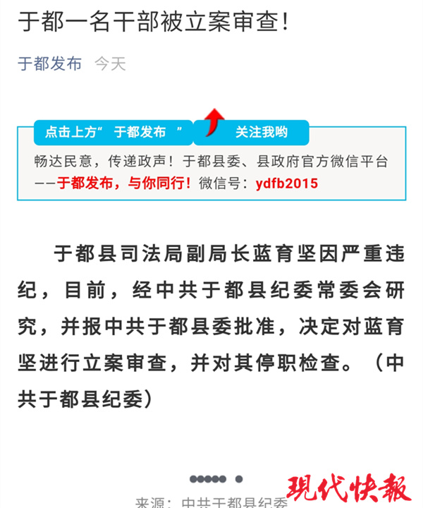 3月16日上午,記者致電江西省于都縣紀委。一名工作人員表示,紀委已經(jīng)介入調(diào)查此事,后續(xù)若有調(diào)查結(jié)果會對外公布。于都縣紀委也在當(dāng)天中午發(fā)布消息:“于都縣司法局副局長藍育堅因嚴重違紀,目前,經(jīng)中共于都縣紀委常委會研究,并報中共于都縣委批準,決定對藍育堅進行立案審查,并對其停職檢查。”