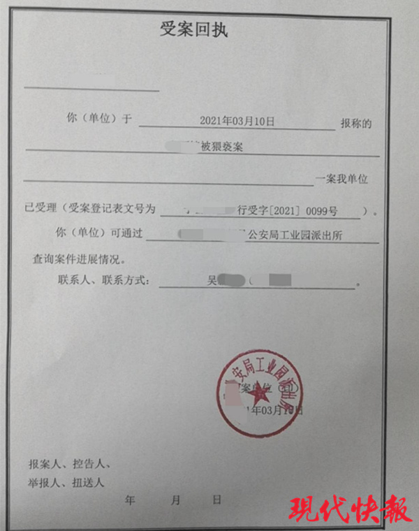 @執(zhí)初815_ 表示,她已在江西、廣東兩地報警,希望為自己的遭遇討個說法?,F(xiàn)代快報記者注意到,@執(zhí)初815_ 在網(wǎng)帖中展示了自己報警后獲取的受案回執(zhí),該回執(zhí)單落款為某地公安局工業(yè)園區(qū)派出所,報警時間為3月10日,原因為“猥褻案”。