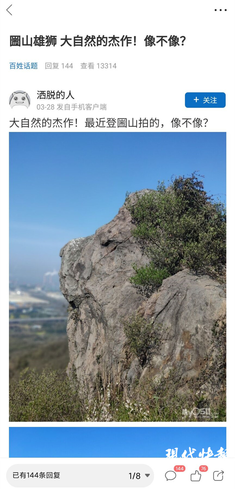 3月28日,網(wǎng)友“灑脫的人”拍下一張圌山雄獅照上傳鎮(zhèn)江本地論壇,不到24小時,點擊量即過萬,留言百余條。照片上,湛藍(lán)的天空下,“獅子”眉眼分明,眼睛、嘴巴緊閉,鼻頭處還有少許白色,巖石上長出的野草則好似“鬃毛”。網(wǎng)友們紛紛驚呼:太像了!有網(wǎng)友稱像一頭“剛剛睡醒的獅子”,有網(wǎng)友稱像“雄獅在閉目養(yǎng)神,蓄勢待發(fā)。”也有網(wǎng)友俏皮發(fā)問:“想到了《獅子王》,辛巴,是你嗎?”