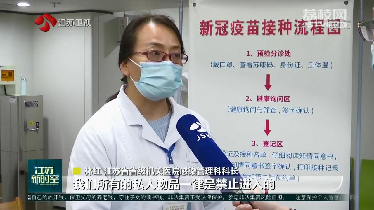 江蘇省省級機關(guān)醫(yī)院感染管理科科長林紅告訴記者,從事疫苗接種的醫(yī)護人員都是二級防護,戴一次性帽子,戴外科口罩,穿隔離衣,并且在接種區(qū)域里面所有的私人物品一律是禁止進入的。