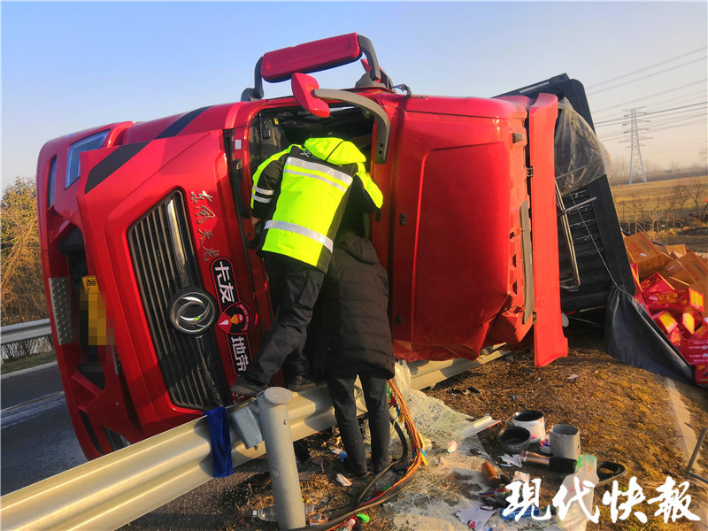 1月18日15時(shí)40許,G1516淮鹽方向往S35建阜方向匝道有大貨車側(cè)翻,值班人員立即通知隊(duì)員鄭友文、李忠鍵趕赴現(xiàn)場。16時(shí)許,執(zhí)法隊(duì)員來到事故現(xiàn)場,只見煙花爆竹等危險(xiǎn)品散落一地。
