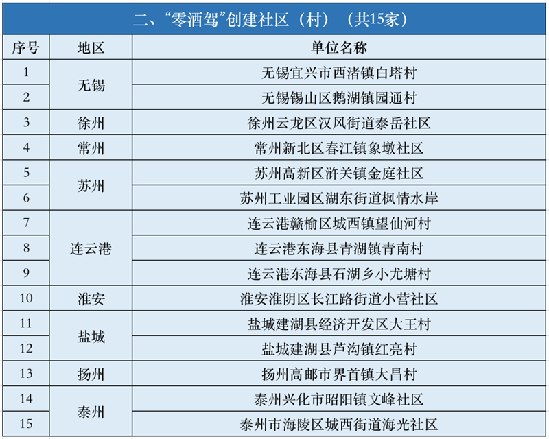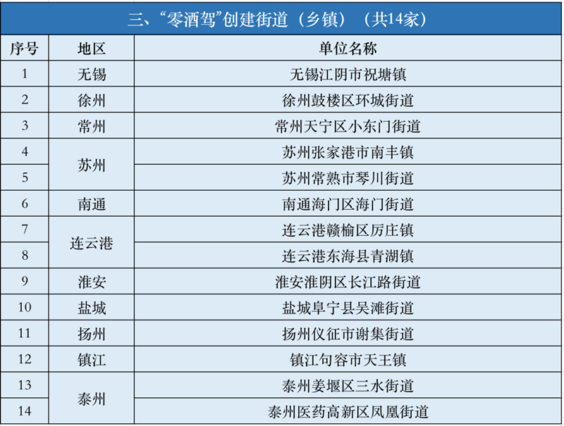 (通訊員 蘇交軒 記者 王瑞)4月9日,現(xiàn)代快報記者獲悉,為有效預防和減少涉酒道路交通事故發(fā)生,根據(jù)公安部“減量控大”工作部署,2021年一季度,江蘇省公安廳交警總隊在全省深入開展“零酒駕”創(chuàng)建活動,廣大單位、社區(qū)(村)、街道(鄉(xiāng)鎮(zhèn))積極支持,踴躍參與創(chuàng)建活動。經(jīng)各地公安交警部門深入調(diào)研,充分征求意見,確定全省“零酒駕”創(chuàng)建單位、社區(qū)(村)、街道(鄉(xiāng)鎮(zhèn))名單。