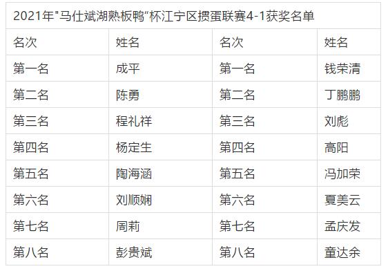 此次比賽采用的是雙人積分編排制,比賽經(jīng)過四輪激烈的比拼后最終2021年“馬仕斌湖熟板鴨”杯江寧區(qū)摜蛋聯(lián)賽4-1比賽結(jié)果名單如下: