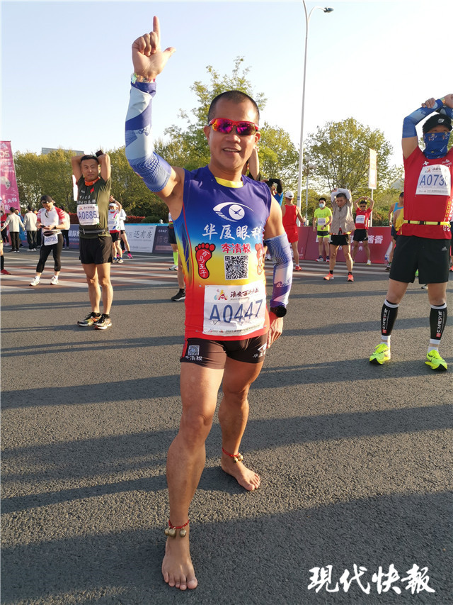 “這是我參加的第158場(chǎng)馬拉松,他們都叫我赤腳大仙,因?yàn)楣饽_跑更接地氣,能感受自然,腳脖子上系的鈴鐺也是保佑平安。”在馬拉松起點(diǎn),來(lái)自廈門的李清模正光著腳做賽前準(zhǔn)備。他告訴記者,每一場(chǎng)馬拉松他都光著腳系著鈴鐺,希望自己能取得較好名次。