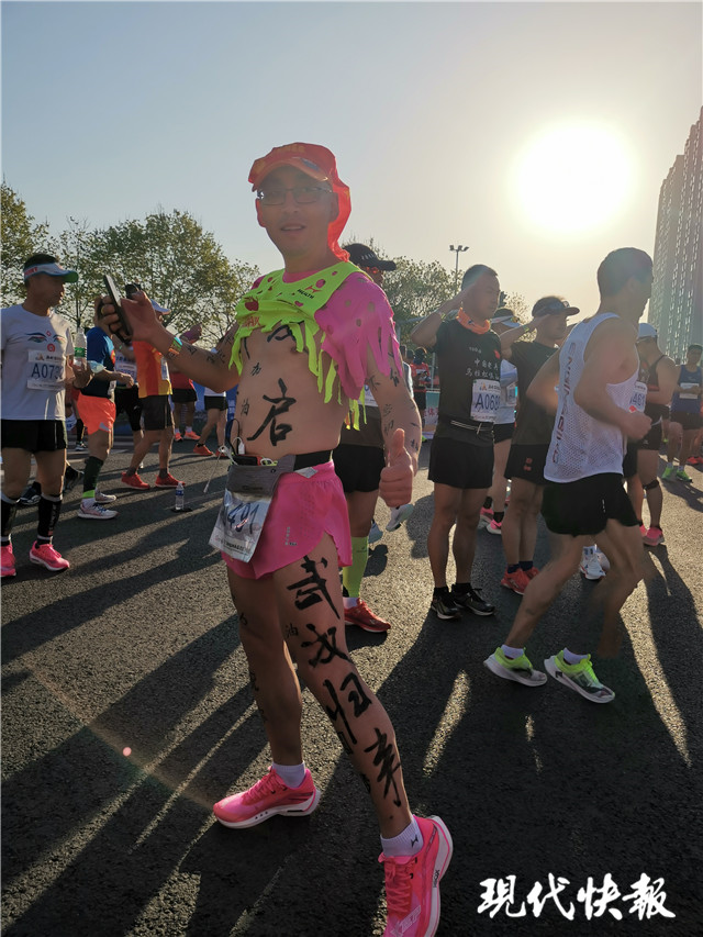 一名渾身寫滿“武漢歸來(lái)”“牢記使命”“加油”字樣的男子吸引了不少人的目光。他告訴記者,他已經(jīng)參加了百余場(chǎng)馬拉松,身上的字是自己彩繪的,這次從武漢來(lái)淮安參賽,其中一個(gè)原因就是感謝江蘇人對(duì)武漢人民的援助。他知道淮安是周恩來(lái)總理的故鄉(xiāng),趁著鍛煉身體的好機(jī)會(huì),正好領(lǐng)略淮安的美好風(fēng)光。