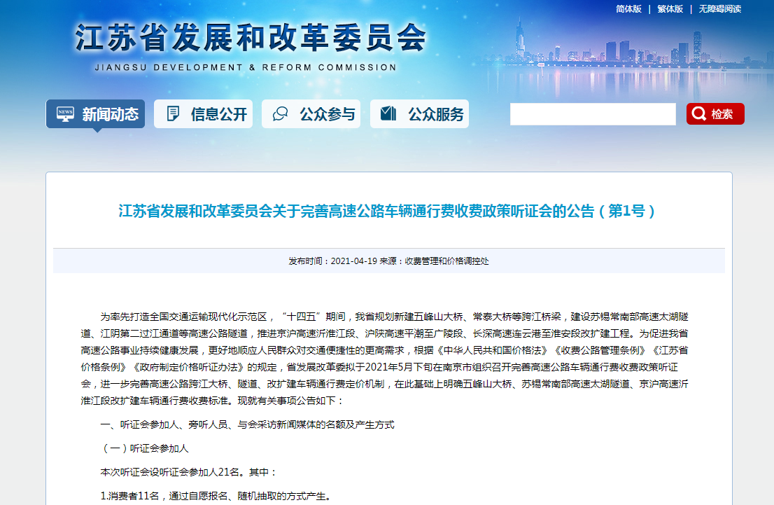 省發(fā)改委發(fā)布的聽證公告中顯示,為促進江蘇高速公路事業(yè)持續(xù)健康發(fā)展,更好地順應(yīng)人民群眾對交通便捷性的更高需求,省發(fā)改委擬于今年5月下旬在南京市組織召開完善高速公路車輛通行費收費政策聽證會,進一步完善高速公路跨江大橋、隧道、改擴建車輛通行費定價機制,在此基礎(chǔ)上明確五峰山大橋、蘇錫常南部高速太湖隧道、京滬高速沂淮江段改擴建車輛通行費收費標準。