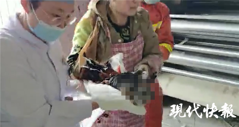 在“電光火石”之間,消防救援人員將笨重的大型機(jī)器一層層切割開來。“好好好,可以了,手出來了,護(hù)士!護(hù)士!”當(dāng)女子的手順利被取出后,救援人員大聲呼喊,隨后等待在現(xiàn)場的醫(yī)護(hù)人員立即上前,幫助女子處理傷口。