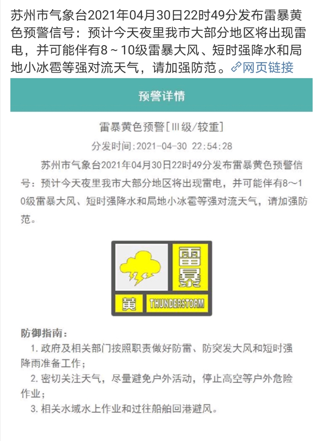 據蘇州市氣象臺5月1日凌晨發(fā)布的消息,雷暴黃色預警信號與大風黃色預警信號已解除。