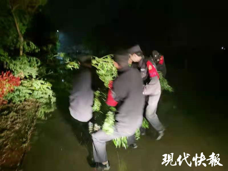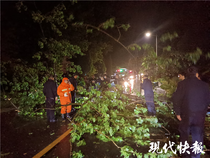 “當(dāng)時大風(fēng)有七八級以上,樹根直徑40公分左右,被連根拔起,幸虧我們?nèi)硕嗔α看蟆?rdquo;民警告訴現(xiàn)代快報記者,沒過一會,現(xiàn)場路面的樹木被全部清理完畢。隨后,大家顧不上渾身濕透,又繼續(xù)投入到疏導(dǎo)交通的工作中去,直至轄區(qū)的交通恢復(fù)通暢。(通訊員供圖)
