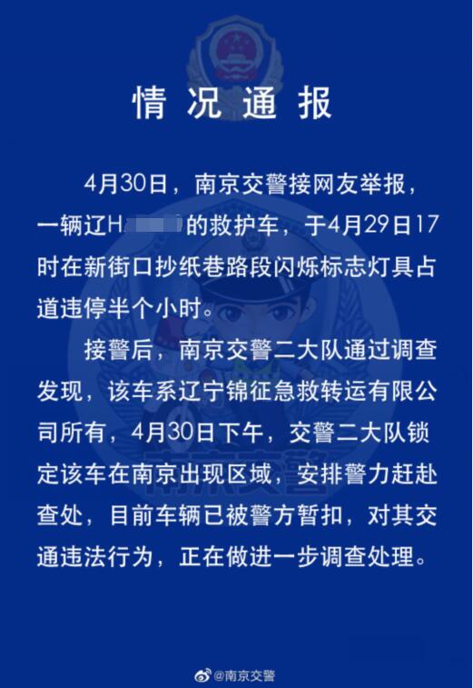 (記者 王瑞)4月29日,南京一牌照為遼H開頭的救護(hù)車開啟警報燈長時間占道搬家導(dǎo)致交通堵塞的視頻引起網(wǎng)友熱議。對此,南京交警二大隊通過調(diào)查發(fā)現(xiàn),該車系遼寧錦征急救轉(zhuǎn)運有限公司所有。