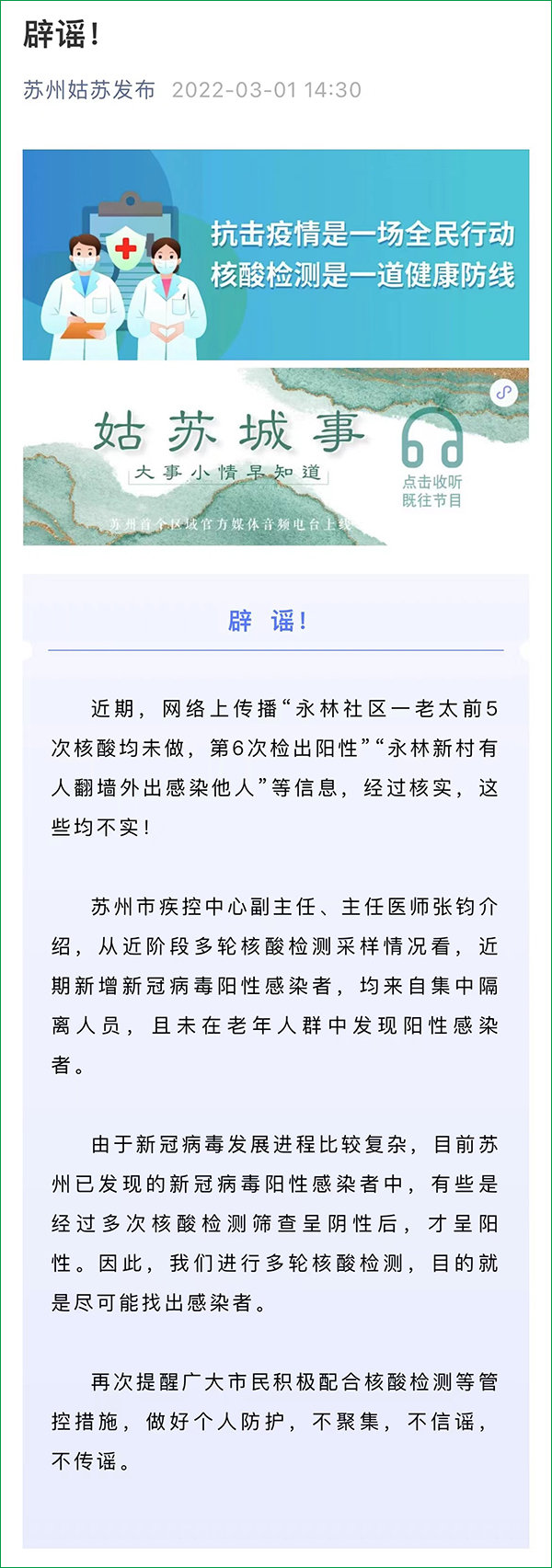 #聯(lián)合辟謠##微博辟謠#【蘇州一社區(qū)老太第6次核酸檢出陽性?蘇州某新村有人翻墻外出感染他人?都是謠言!】近期,網(wǎng)傳蘇州“永林社區(qū)一老太前5次核酸均未做,第6次檢出陽性”“永林新村有人翻墻外出感染他人”等信息。經(jīng)核實,這些均系不實內(nèi)容!據(jù)蘇州市疾控中心副主任、主任醫(yī)師張鈞介紹,從近階段多輪核酸檢測采樣情況看,近期新增新冠病毒陽性感染者均來自集中隔離人員,且未在老年人群中發(fā)現(xiàn)陽性感染者。由于新冠病毒發(fā)展進程比較復雜,目前蘇州已發(fā)現(xiàn)的新冠病毒陽性感染者中,有些是經(jīng)過多次核酸檢測篩查呈陰性后才呈陽性。因此,蘇州進行多輪核酸檢測,目的就是盡可能找出感染者。提醒廣大市民在積極配合核酸檢測等管控措施時,不造謠、不信謠、不傳謠。@蘇州姑蘇發(fā)布