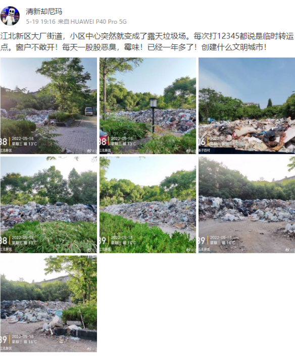 那么,此處設(shè)置的垃圾臨時(shí)堆放場(chǎng)是否符合相關(guān)規(guī)定,是否需要向城管部門報(bào)備呢?記者聯(lián)系了南京大廠街道城市管理綜合執(zhí)法大隊(duì)長黃強(qiáng)。他表示,類似這樣的集中轉(zhuǎn)運(yùn)點(diǎn)很多小區(qū)都有,不需要向城管部門報(bào)備,主要是物業(yè)公司將轄區(qū)內(nèi)一些暫時(shí)無法第一時(shí)間運(yùn)出去的裝潢垃圾、生活垃圾集中堆放,再運(yùn)到指定地點(diǎn)。“通常要求即運(yùn)即清,由于疫情防控等原因,此處堆放點(diǎn)垃圾堆積量過大,且沒有任何覆蓋,造成周邊居民投訴不斷,我們已經(jīng)要求施工方將垃圾清走了”,黃強(qiáng)說,目前已經(jīng)立案查處,下一步將約談物業(yè)方,做好相關(guān)規(guī)定和處罰。